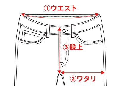 ②ワタリ幅(太もも):ウエストがOKでも太ももが入らない、ということもあるので念のためチェック